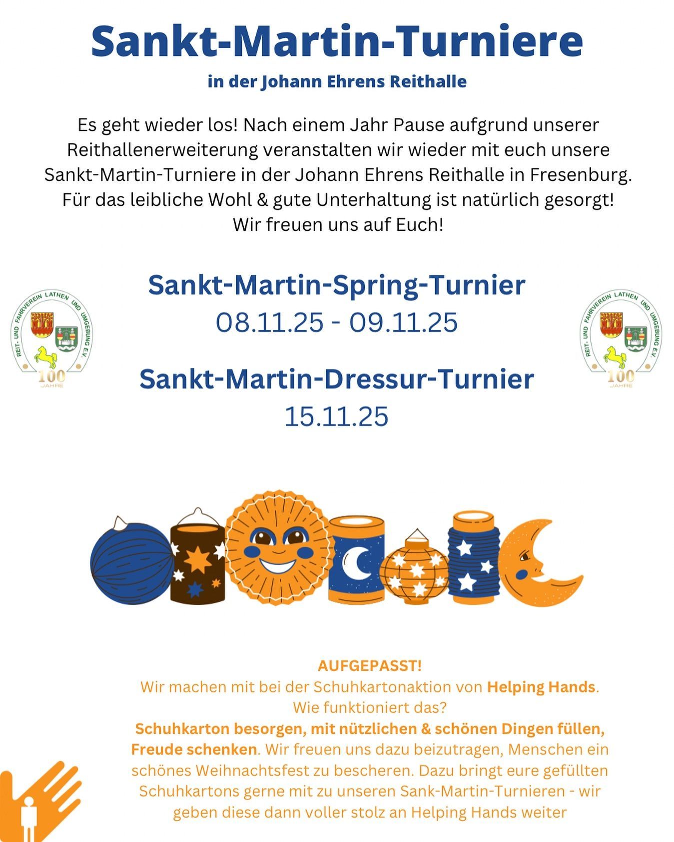 Es geht wieder los! Die Sankt-Martin-Turniere in der frisch erweiterten Johann Ehrens Reithalle stehen vor der Tür. Ebenfalls freuen wir uns darüber, dass wir bei der Schuhkartonaktion von Helping Hands unterstützen können. Kommt vorbei!