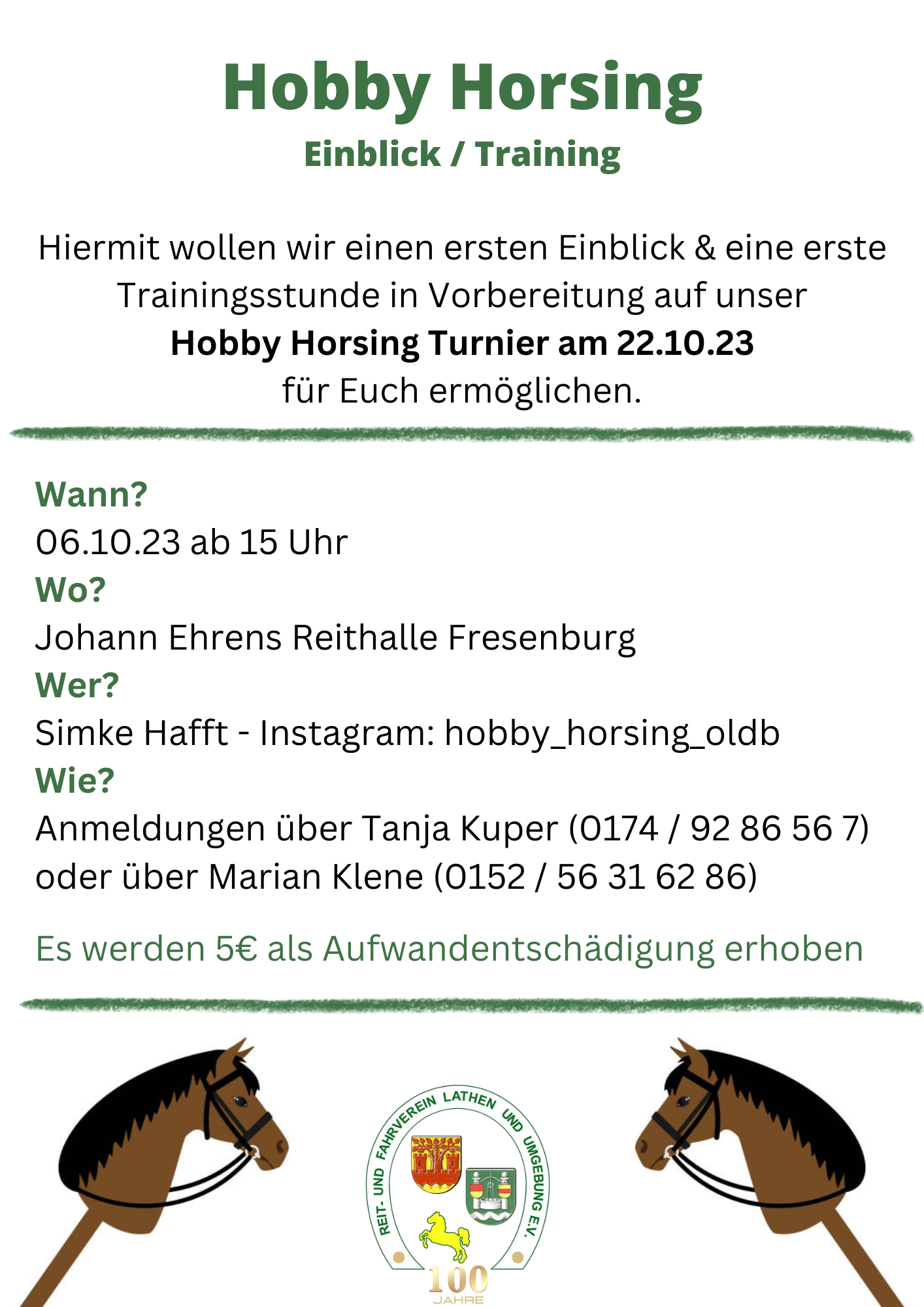 Hiermit wollen wir euch über unser Hobby Horsing Turnier im Oktober informieren - wir bieten zusammen mit Simke Hafft die Möglichleit einen Einblick & ein erstes Training im Bereich vom Hobby Horsing zu bekommen.