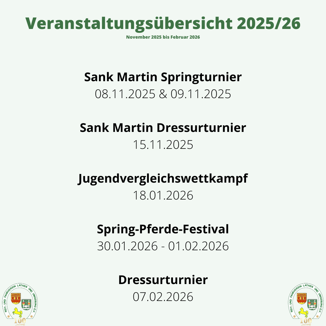 Auch in diesem Jahr fanden unsere traditionellen Sankt Martin Turniere in unserer Johann Ehrens Reithalle statt. Vom 11.11.23 - 12.11.23 fand unser Sankt Martin Spring Turnier statt & am 18.11.23 unser Sankt Martin Dressur Turnier. An diesen zwei Turnierwochenenden gab es wieder viele spannende Prüfungen zu verfolgen. Auch der heilige Sankt Martin war zu Gast. Die Bilder folgen in den kommenden Tagen